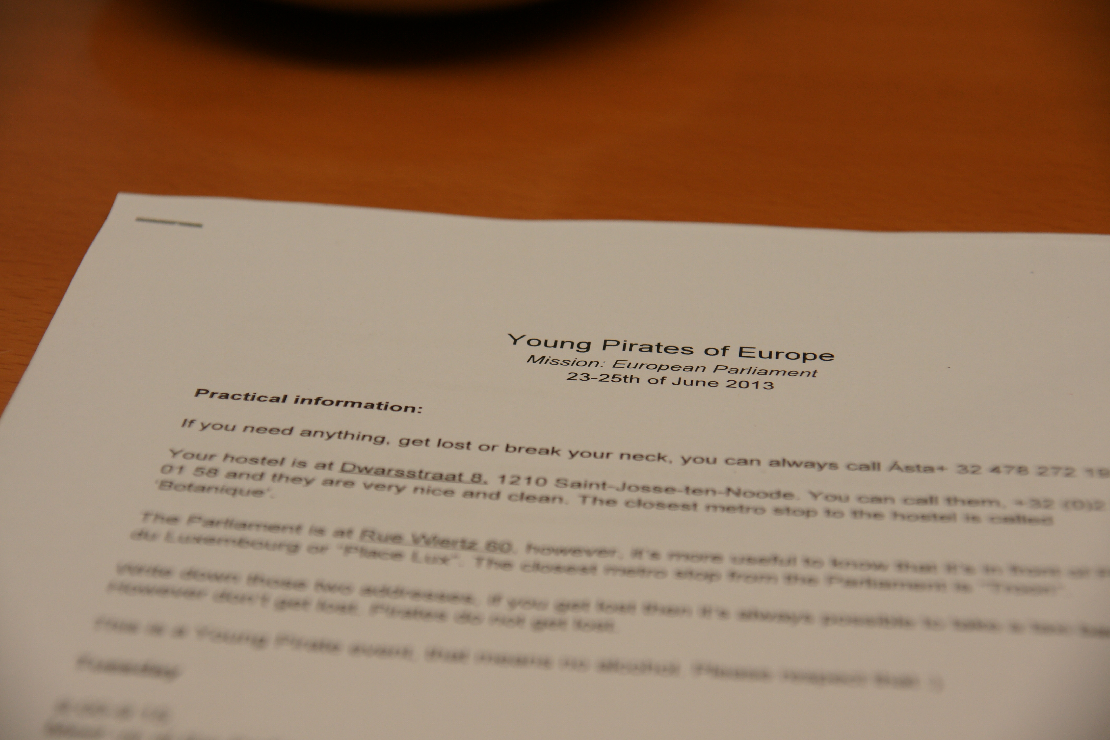 Torstaina otimme osaa Young Pirates of Europen (YPE) alustavaan perustamistapaamiseen, jossa kirjoitimme ja hyväksyimme Elokuussa perustettavan yhdistyksen säännöt. Paikalla oli edustajia Belgian, Ranskan, Ruotsin, Saksan, Islannin, Luxemburgin ja Tsekin piraateista. Piraattinuoria oli edustamassa paikalla varapuheenjohtaja Joel Kortesaari ja entinen vpj. Lotta Söderholm.